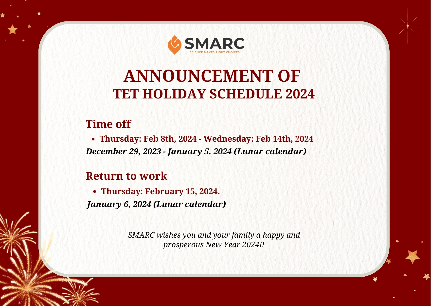 SMARC trân trọng thông báo tới Quý Đối tác, Quý Khách hàng và toàn thể nhân viên lịch nghỉ Tết Nguyên Đán 2024 như sau: