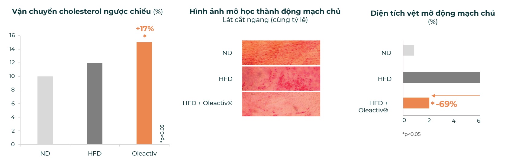 Đáng chú ý, Oleactiv® còn ngăn ngừa sự hình thành vệt mỡ động mạch chủ. Ở mức mô học, diện tích mảng xơ vữa ở động mạch chủ giảm 69% sau 12 tuần bổ sung Oleactiv®.