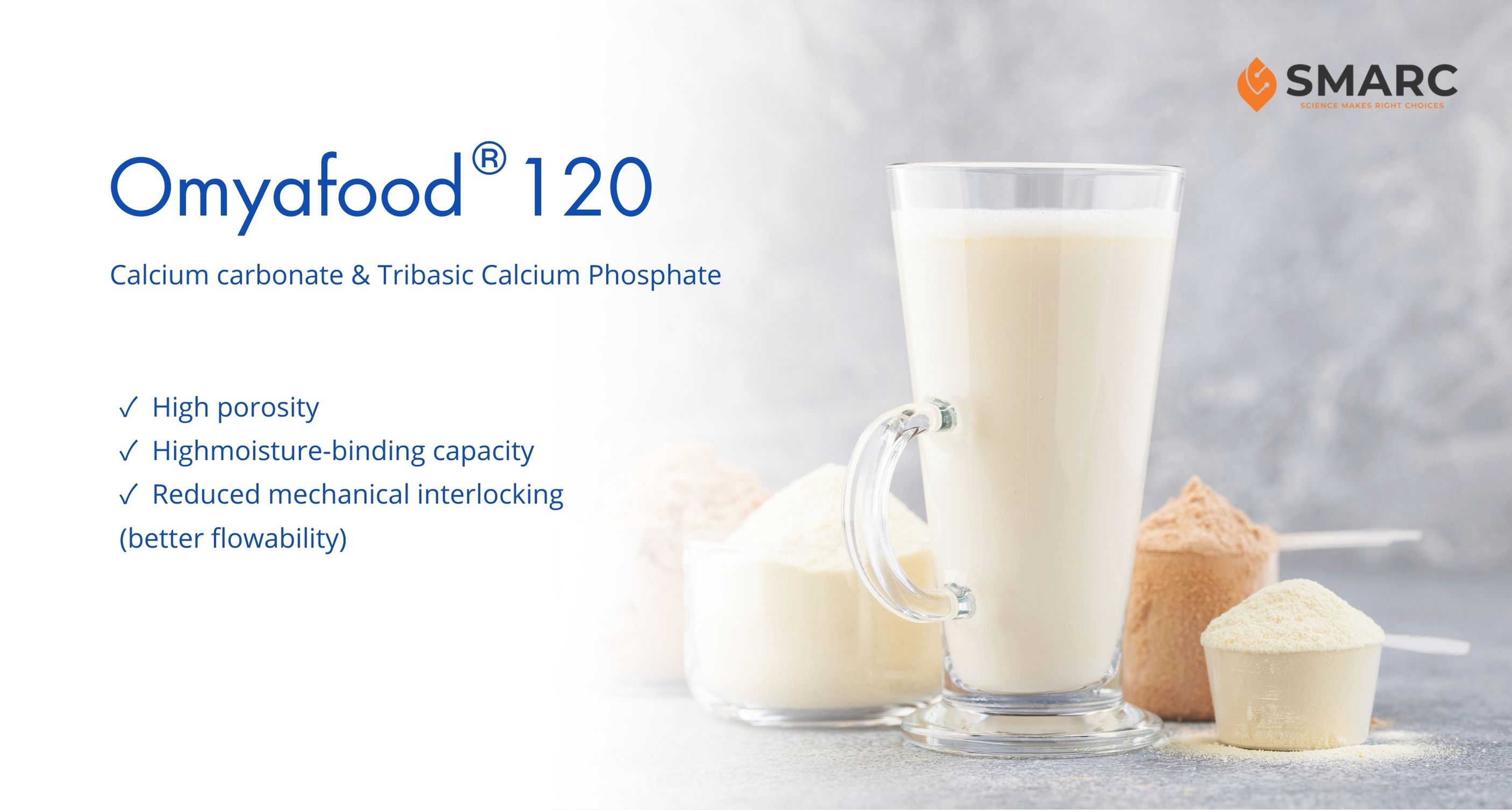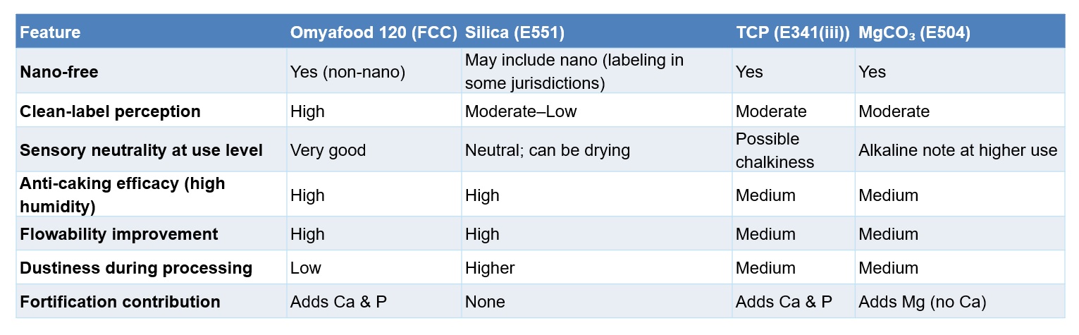 Beyond its technical function, Omyafood® 120 contributes calcium (Ca) and phosphorus (P), providing an additional nutritional benefit. This sets it apart from silica (no fortification value) and MgCO₃ (only supplies magnesium without calcium).